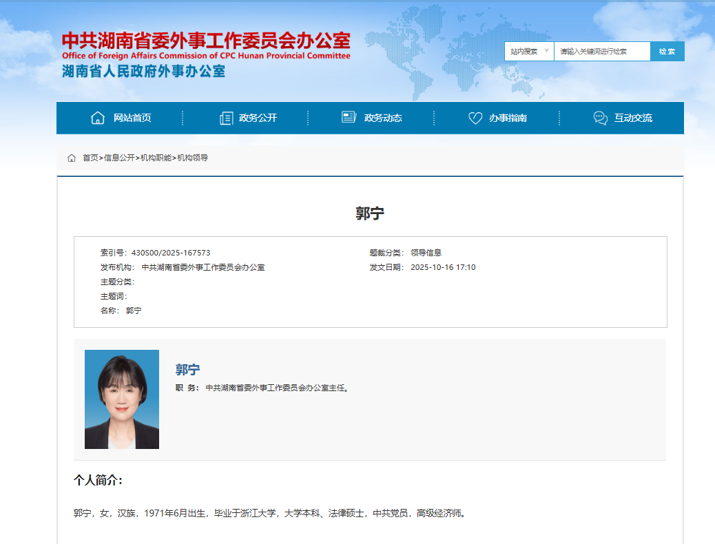 据中共湖南省委外事工作委员会办公室官网“机构领导”一栏显示,郭宁已任中共湖南省委外事工作委员会办公室主任。