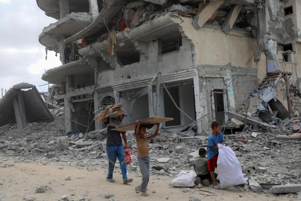 10月12日,在加沙地带南部汗尤尼斯,重返家园的巴勒斯坦人走过严重受损的建筑。新华社发(里泽克·阿卜杜勒贾瓦德摄)