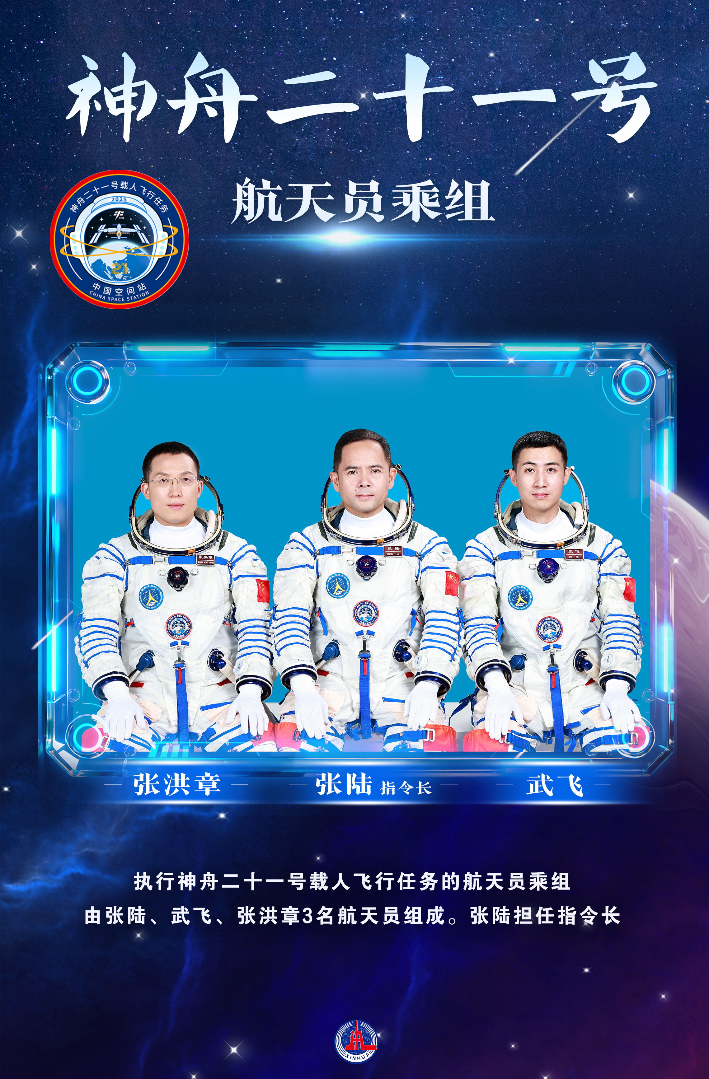 10月30日上午,神舟二十一号载人飞行任务新闻发布会在酒泉卫星发射中心举行。中国载人航天工程新闻发言人、中国载人航天工程办公室综合计划局局长张静波在会上表示,经研究决定,瞄准10月31日23时44分发射神舟二十一号载人飞船,飞行乘组由张陆、武飞、张洪章组成,张陆担任指令长,3名航天员分别为航天驾驶员、飞行工程师和载荷专家,涵盖了我国现役3种航天员类型。