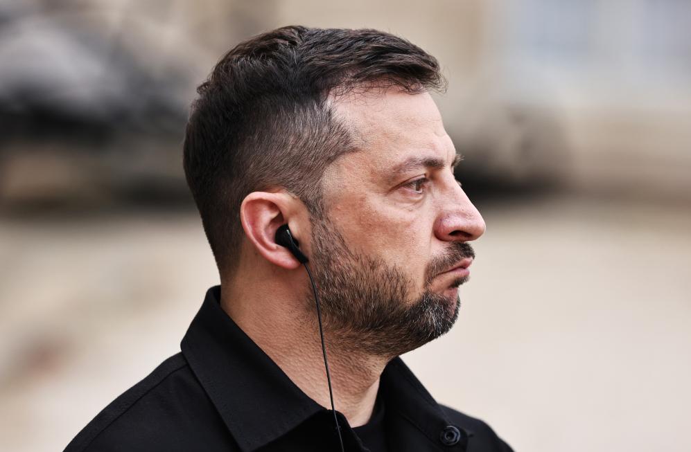 9月3日,在法国巴黎总统府爱丽舍宫,来访的乌克兰总统泽连斯基与法国总统马克龙(不在画面中)共同会见记者。新华社记者高静摄