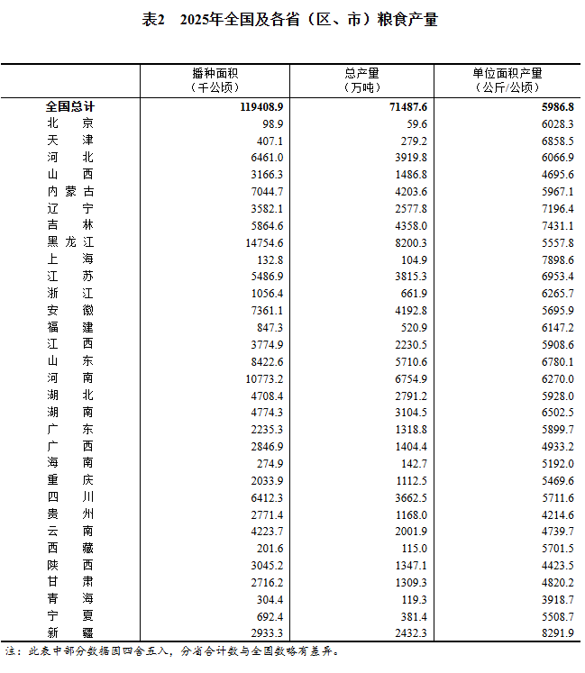 根据对全国31个省(区、市)的调查,2025年全国粮食播种面积、单位面积产量和总产量分别如下: