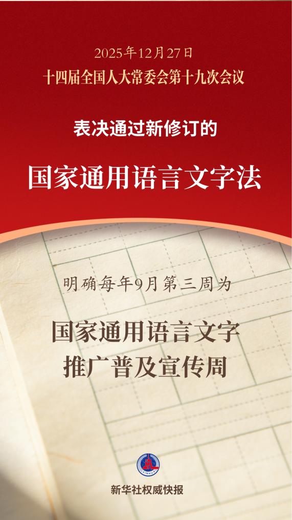 新华社北京12月27日电(记者魏冠宇)十四届全国人大常委会第十九次会议12月27日表决通过新修订的国家通用语言文字法,明确每年9月的第三周为国家通用语言文字推广普及宣传周。