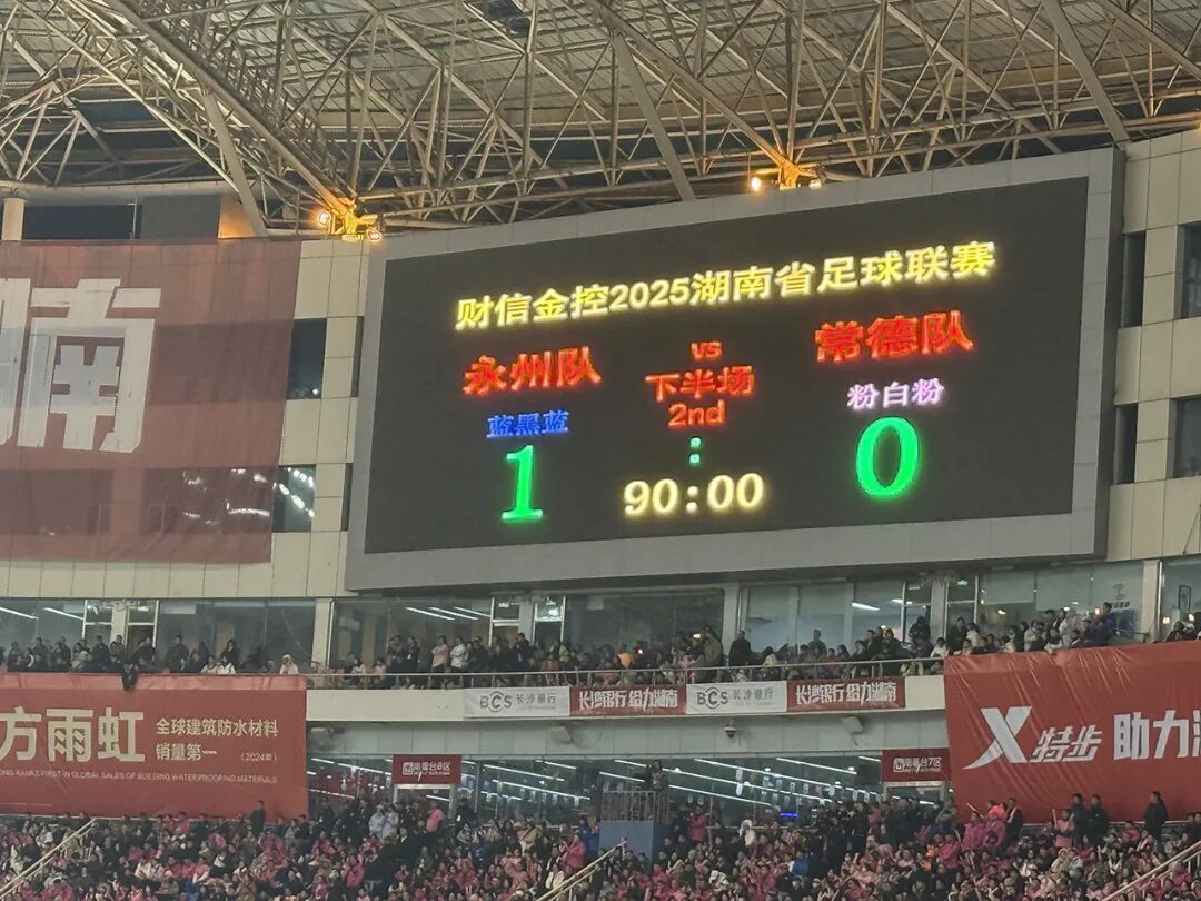 今天(12月27日)晚上,在长沙贺龙体育中心刚刚结束的2025湖南省足球联赛(湘超联赛)决赛中,永州队以1 :0战胜常德队,夺得冠军!