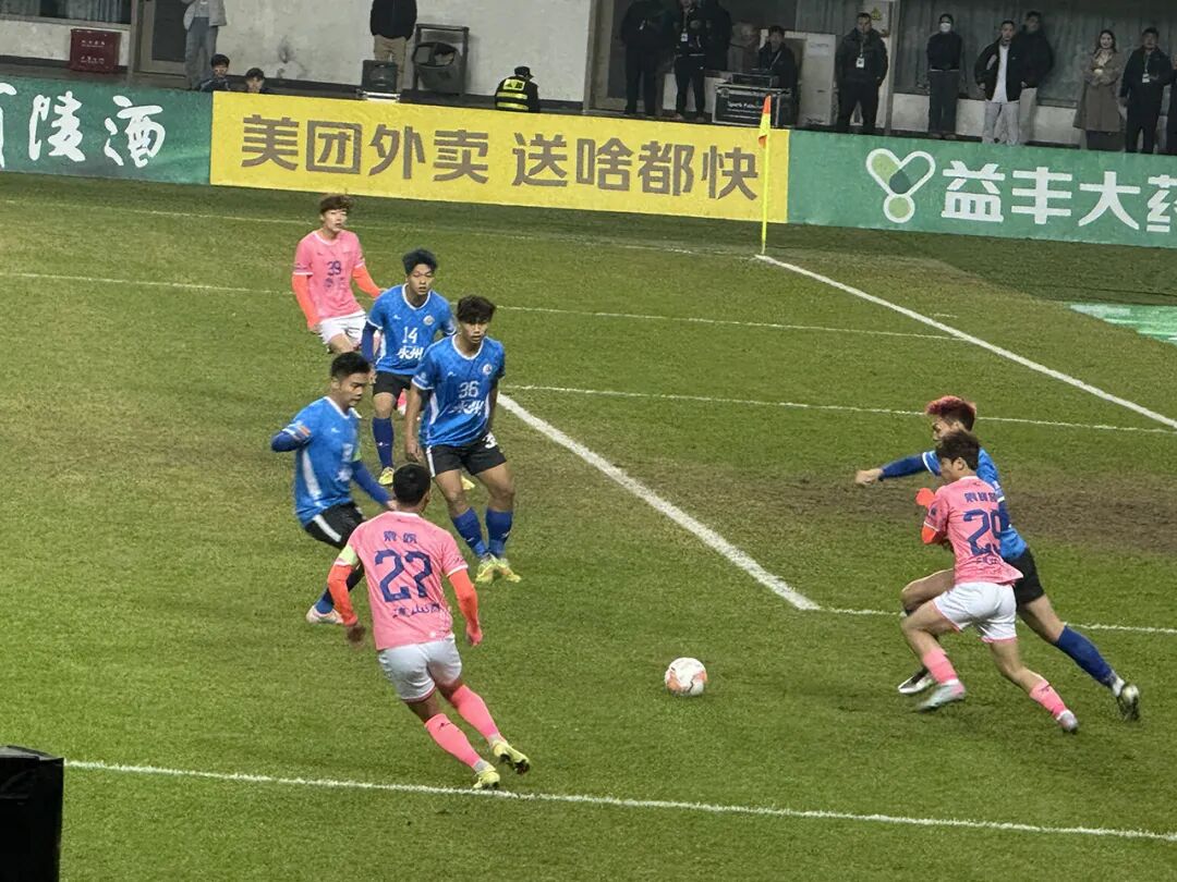 比赛时间来到第58分钟,永州队获得角球机会,皮球打入禁区后,双方一片混战,永州队46号队员谷文杰抓住机会,一记势大力沉的头球破门得分。
