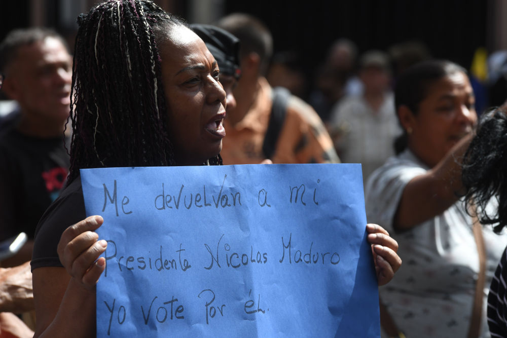 1月3日,一名抗议者手举标语在委内瑞拉首都加拉加斯参加抗议活动。新华社发(马科斯·萨尔加多摄)
