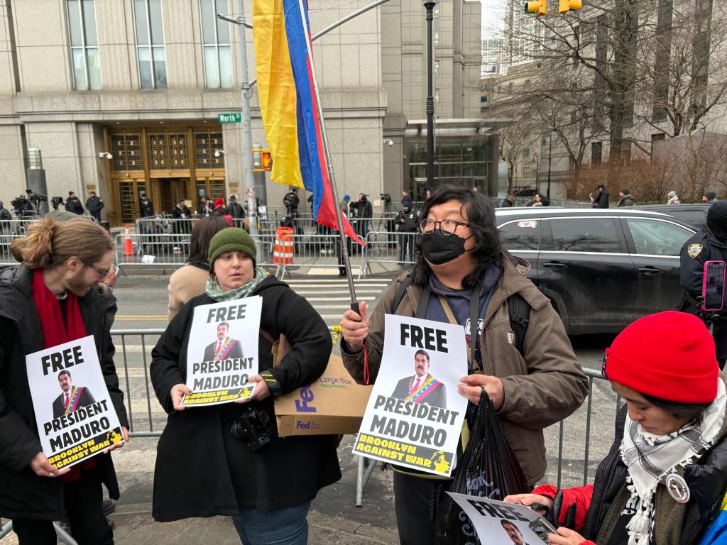 “释放马杜罗总统”“这不过是一场电视秀”——法庭外,抗议人群聚集。