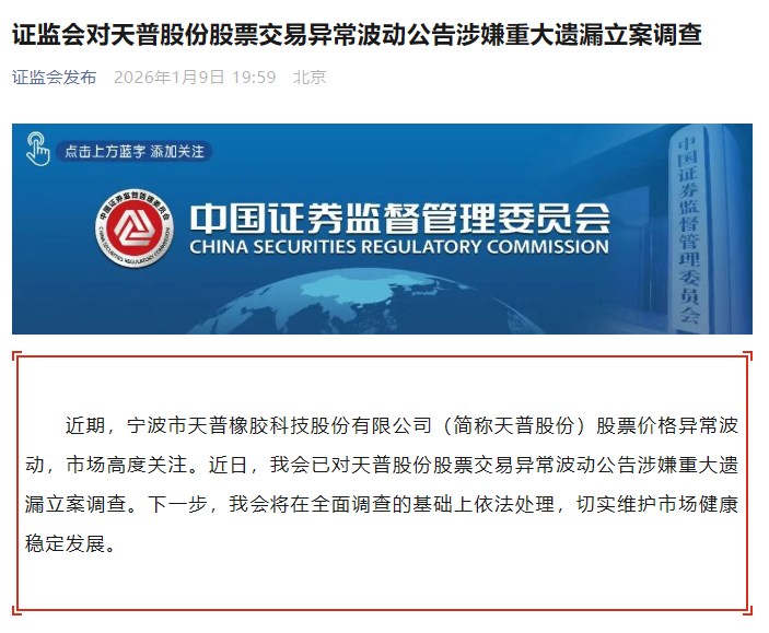 近期,宁波市天普橡胶科技股份有限公司(简称天普股份)股票价格异常波动,市场高度关注。近日,我会已对天普股份股票交易异常波动公告涉嫌重大遗漏立案调查。下一步,我会将在全面调查的基础上依法处理,切实维护市场健康稳定发展。