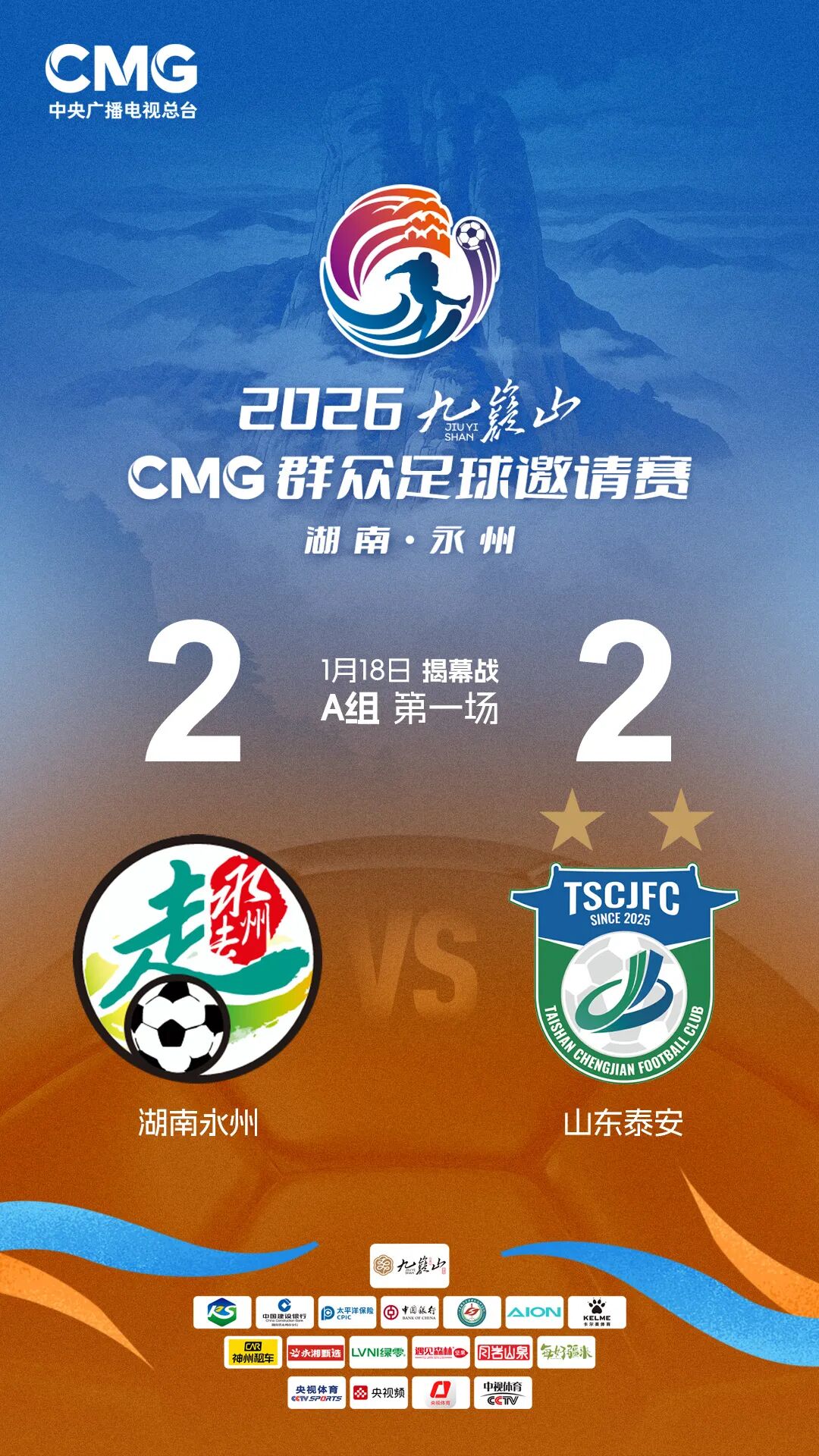 今天,2026九嶷山CMG群众足球邀请赛在永州火热开踢,A组第一场由湖南永州队对阵山东泰安队。最终,湖南永州队和山东泰安队以2:2战平。
