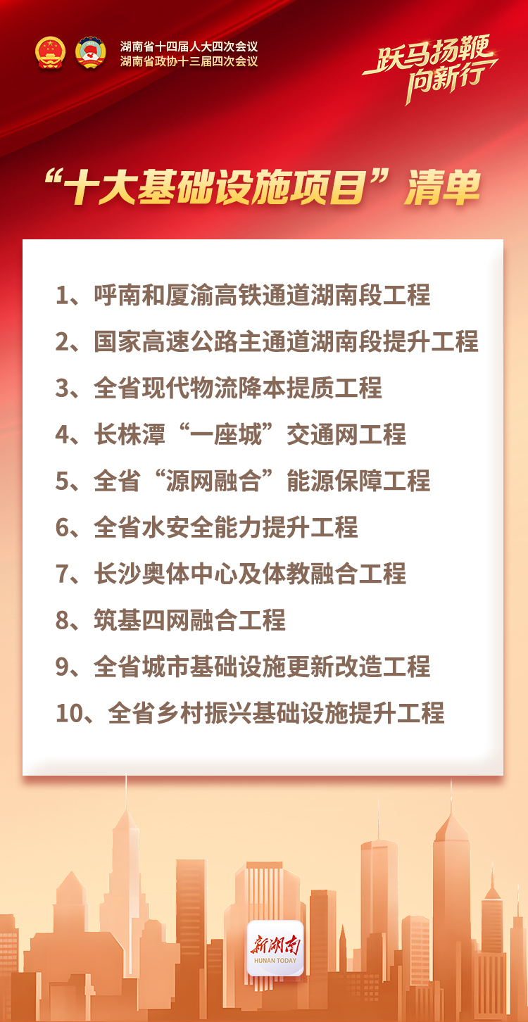 2026年湖南将持续开展“项目大谋划、谋划大项目”,抓好总投资2万亿元的389个省重点项目,推进能源“源网荷储”一体工程、算力“四网融合”工程、城市基础设施更新改造工程等“十大基础设施项目”建设。加快邵永、铜吉、长赣、宜常、永清广、黔吉等6条高铁,京港澳和沪昆扩容、张官等17条高速公路,以及梅山灌区、金塘冲水库等重大水利工程建设。