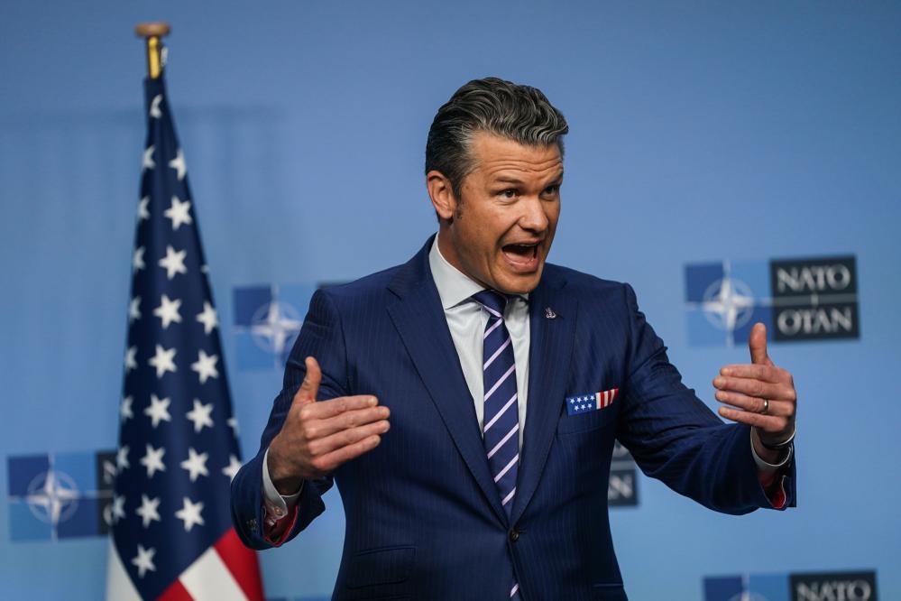 2025年10月15日,在比利时布鲁塞尔,美国国防部长赫格塞思在与北约秘书长吕特共同举行的记者会上发言。新华社记者 彭子洋 摄