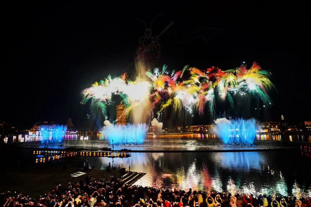 “马踏星河”璀璨焰火与冷焰火组合率先在石渚湖畔绽放,金色火雨与夜空交织勾勒盛唐画卷;