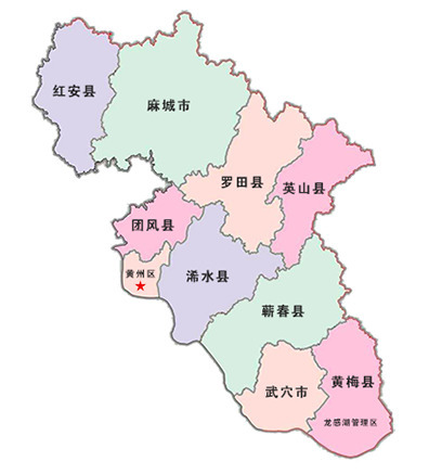 作为湖北地级市的黄冈,地处湖北东部、大别山南麓、长江中游北岸,京九铁路中段,总面积17453平方千米。下辖七县(红安、罗田、英山、浠水、团风、蕲春、黄梅),二市(武穴、麻城),黄州区、龙感湖管理区和黄冈经济开发区。