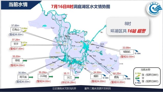 当前,湘、资、沅、遭水干流水势平稳,东南洞庭湖各站水位回落,环洞庭湖大部分水文(水位)站水位仍在警戒水位以上。据湖南水文最新数据:今日8时,洞庭湖区共有16个水文(水位)站超过警戒水位。其中:洞庭湖城陵矶站水位33.99米,超警1.49米,较昨日8时回落0.13米;安乡县安乡站水位37.28米,超警0.28米,较昨日8时上涨0.07米;沅江市南咀站水位35.50米,超警1.50米,与昨日8时水位持平;益阳市沅江站水位35.11米,超警1.61米,较昨日8时回落0.06米;湘阴县湘阴站水位34.50米,超警0.50米,较昨日8时回落0.14米。