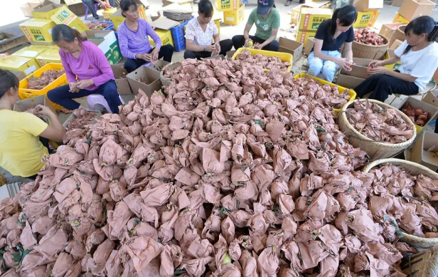 (7月21日,汝城县文明瑶族乡二都村,村民在忙着分拣、包装成熟的黄金柰李准备发往上海。湖南日报记者 李健 摄)
