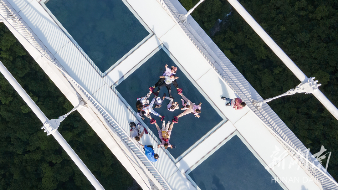 (5月3日,张家界大峡谷景区,游客在玻璃桥上享受假日时光。湖南日报全媒体记者 刘建光 摄)