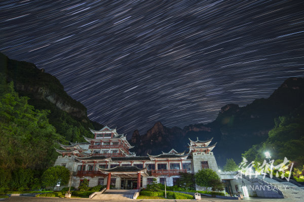(5月3日凌晨,张家界天门山景区,梦幻般的星轨。谢杰 摄)
