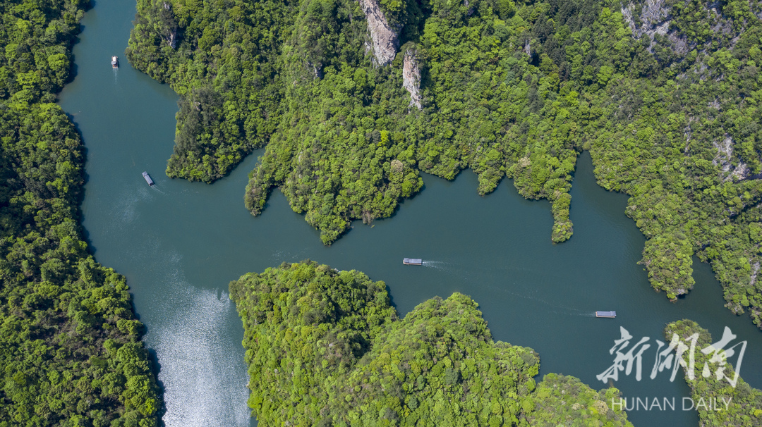 (5月3日,俯瞰张家界市武陵源区宝峰湖景区,峰峦叠翠,碧水如镜。湖南日报全媒体记者 辜鹏博 摄)