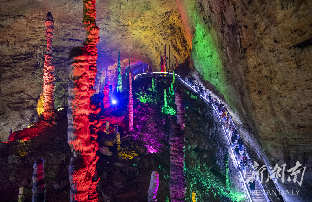 (5月2日,张家界市武陵源区黄龙洞景区,游客在观光游玩。湖南日报全媒体记者 辜鹏博 摄)