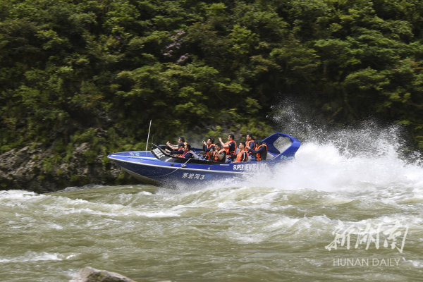 (5月4日,张家界茅岩河风景区,游人在高山峡谷间体验水上快艇。湖南日报全媒体记者 辜鹏博 摄)