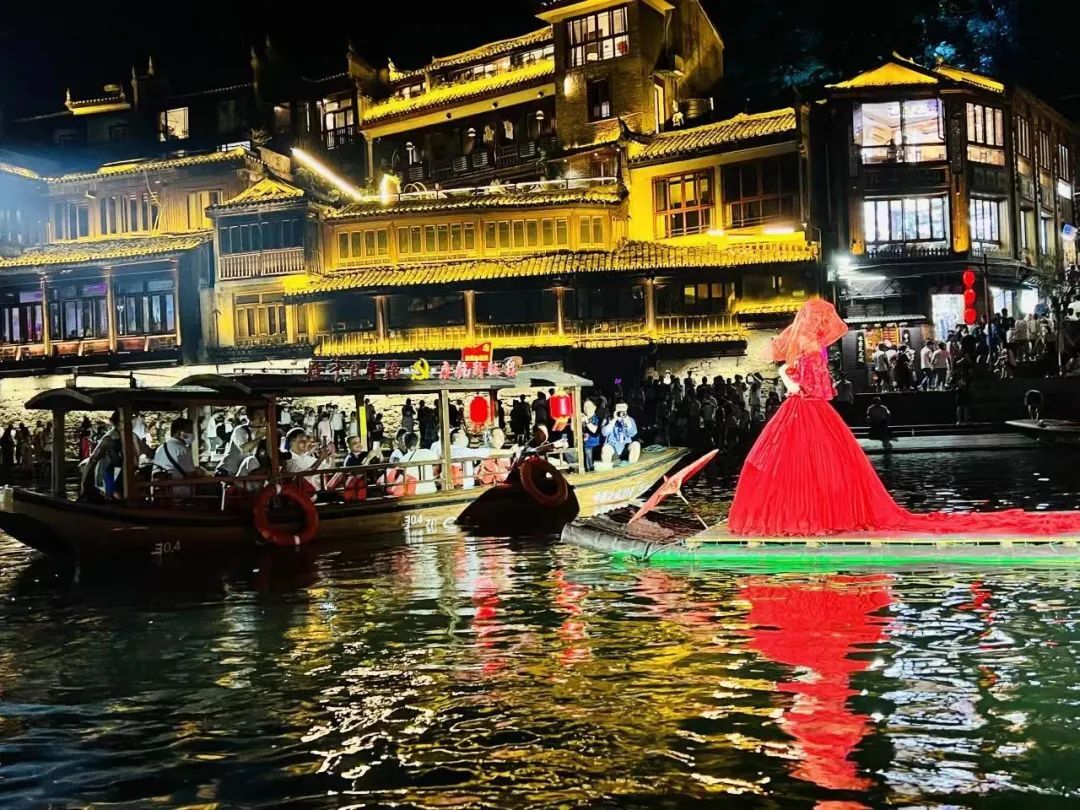 7月27日晚,大型滨水实景光影演艺秀《花开凤凰门·梦回金水寨》在凤凰古城上演,乌篷船、沱江号子、苗族水腔、吊脚楼与机车趴、摇滚乐、激光舞相融合,诠释了古城凤凰的浪漫,前来观看的游客将舞台围得水泄不通。