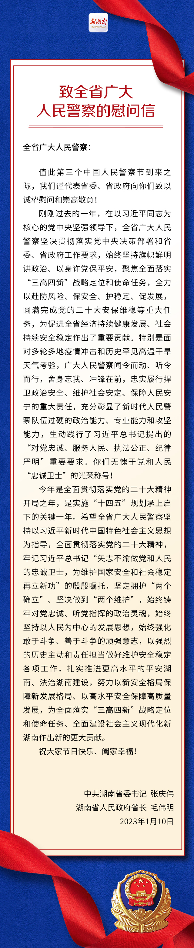 张庆伟、毛伟明致全省广大人民警察的慰问信