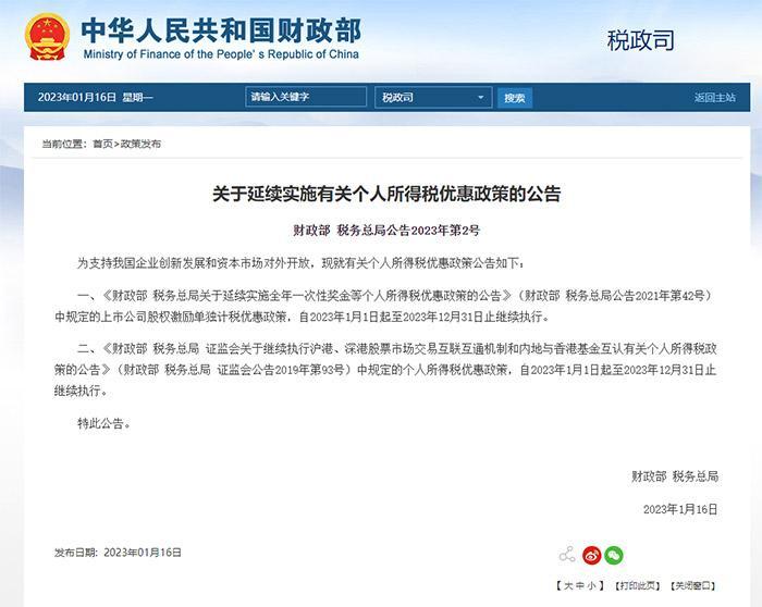 二、《财政部 税务总局 证监会关于继续执行沪港、深港股票市场交易互联互通机制和内地与香港基金互认有关个人所得税政策的公告》(财政部 税务总局 证监会公告2019年第93号)中规定的个人所得税优惠政策,自2023年1月1日起至2023年12月31日止继续执行。