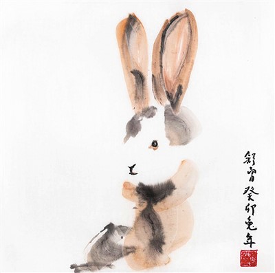 兔年生肖画属于中国画中花鸟画的一类。中国画历来强调形神兼备,太像则匠,不像则妄,要在“似与不似”之间。舒勇兔年生肖画讲究在“似与不似”之间维持平衡。从“似”来看,这批作品在“形似”上下功夫,师法自然,把兔画得惟妙惟肖、栩栩如生,特别是通过带有工笔成分的描绘,把兔子眼睛神态和光感,用颜色渲染出来,别具风味。从“不似”来看,这批作品在“神似”上求效果,从所谓的“画必似之”跳出来,采用抽象表现主义和大写意结合的方法,力争笔墨传神,做到“不似之似”。比如,有时候兔子只画一只眼睛,留给大家想象的空间。通过这种空间和留白,体现了中国画的简约对比;而直接的泼洒,加之对色彩的对比,通过墨盒色彩的碰撞和水的晕染,使兔毛得到很好的表现。这种大写意的创作,看似轻描淡写,却意蕴深邃,笔随意到,传递着一种神韵、灵动、生气,尺幅寸缣,却意象千里。