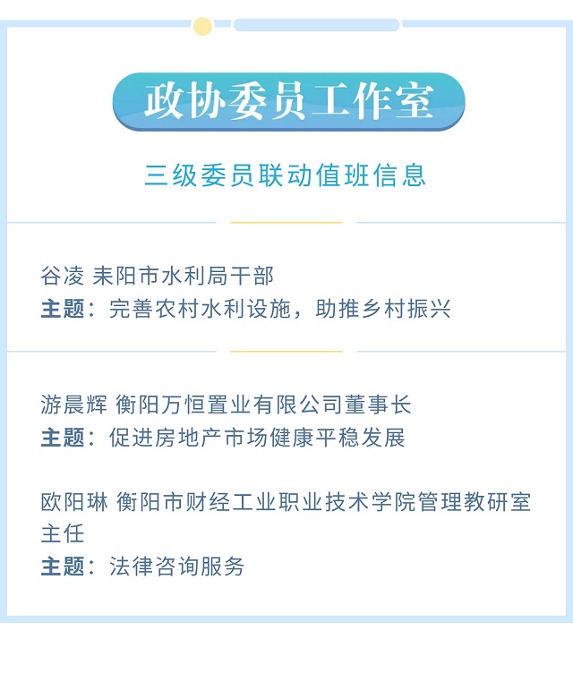 5.住湘全国政协委员、湖南省政协主席毛万春近日在长沙部分政协委员工作室调研时指出,要持续充分发挥委员自身专长优势和政协委员工作室阵地作用,更好推动习近平总书记“政协委员要更好联系和服务所在界别的群众”重要指示落实落地、开花结果。