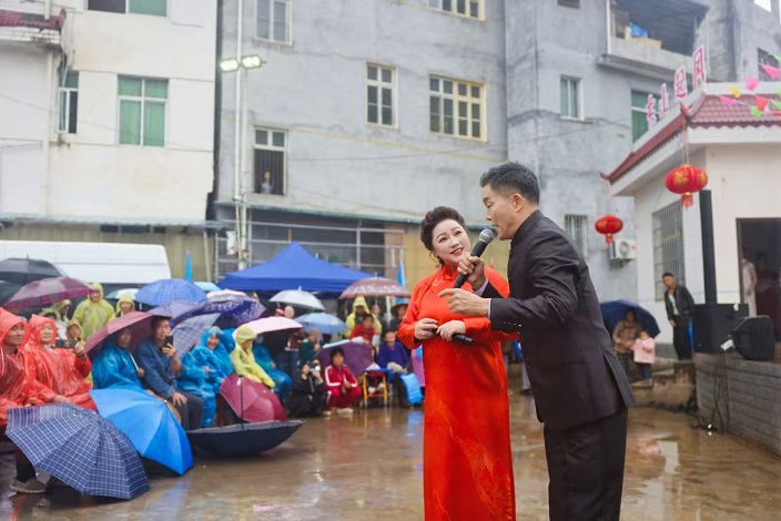 歌、舞、戏曲、魔术、小品等各门类节目轮番上演,虽然天空一直飘着绵绵细雨,但演员们依然以饱满的热情、精湛的技艺倾情演绎,赢得了现场观众阵阵掌声与喝彩声。台上好戏连台,台下掌声不断,欢声笑语漫过广场,暖意在你一言我一语的闲谈中流淌,现场满是温暖热闹的氛围。