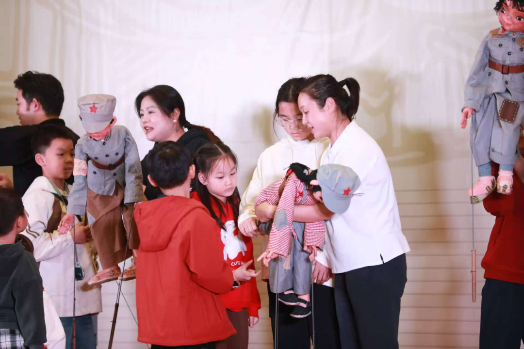 为了让孩子们有更直观的体验,几个孩子在演职人员的指导下学习简易操纵木偶,随着耐心点拨,原本略显笨拙的木偶在孩子们手中逐渐“活”了起来,相继完成眨眼、握手、敬礼等动作。“我的木偶会跳舞啦!”“这种感觉太神奇了!”孩子们兴奋地挥舞着竹棒,脸上满是成就感。
