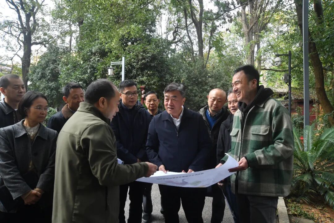 湖南广播电视台娱乐频道办公地点与湖南烈士公园一墙相隔。委员们从娱乐频道一侧,穿过围墙附属便门进入烈士公园,沿步道实地察看公园内民俗风情园、红军渡等区域,结合规划图纸听取项目情况介绍。随后,委员们来到娱乐频道老演播厅、办公楼等地,了解频道发展、场地利用、项目方案等情况,并与湖南广播影视集团、娱乐频道、长沙市城市管理局、烈士公园管理处、省演艺文化传播公司等单位负责同志就“馆园融合”规划建设、设施拓展贯通、项目深化合作等座谈交流。