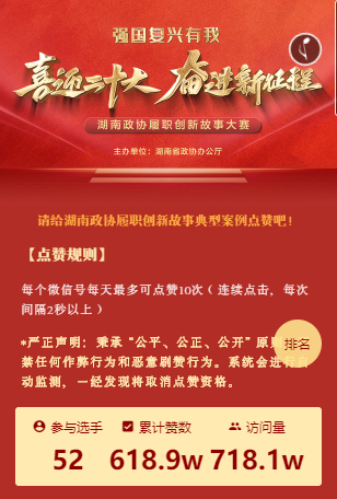 8月5日24点,“喜迎二十大 奋进新征程——湖南政协履职创新故事大赛”案例短视频集中宣传展示活动圆满画上句号,火热的数据彰显着社会各界为湖南政协履职创新点赞的热情。