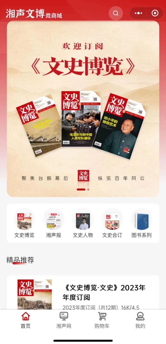 「湘声文博微商城」小程序是湖南省政协融媒体中心全新打造的线上商城,主打产品是政协融媒旗下报刊《湘声报》《文史博览·文史》《文史博览·人物》和图书,以及其它优选产品等。