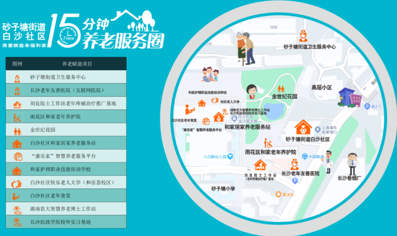 2020年以来,在省、市、区民政部门的支持下,长沙熙康和白沙社区居家养老服务站合作,打造以居家为基础、社区为依托、机构为补充、医养相结合的“城市15分钟养老服务圈”。