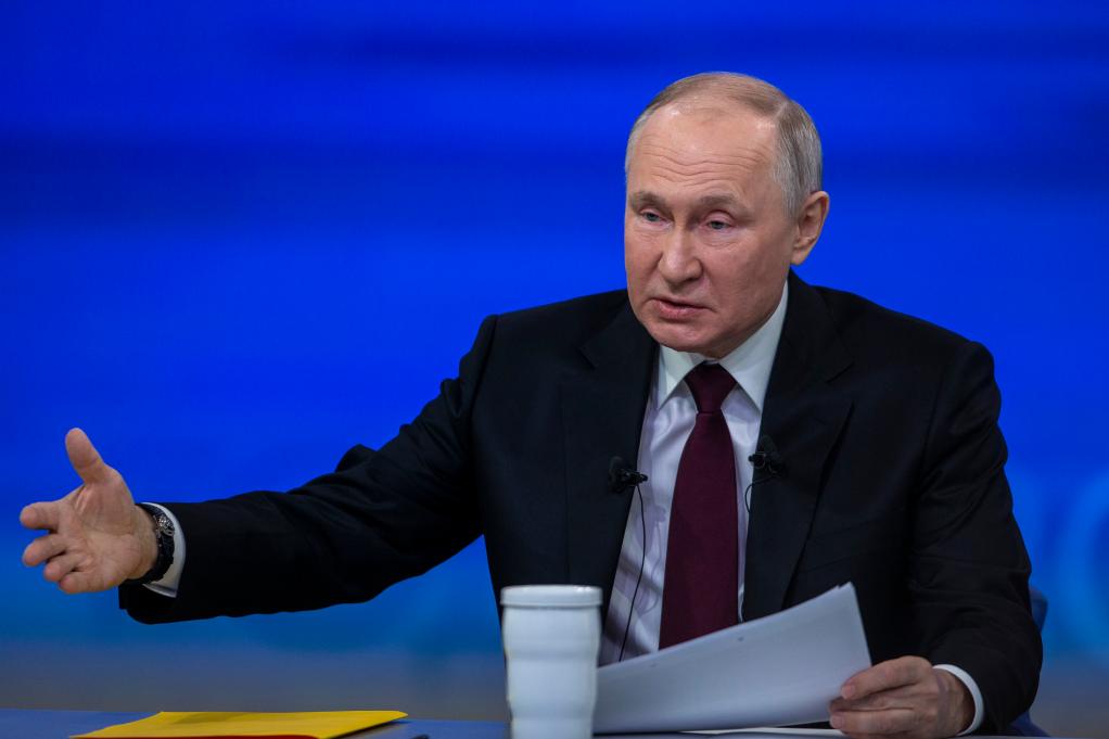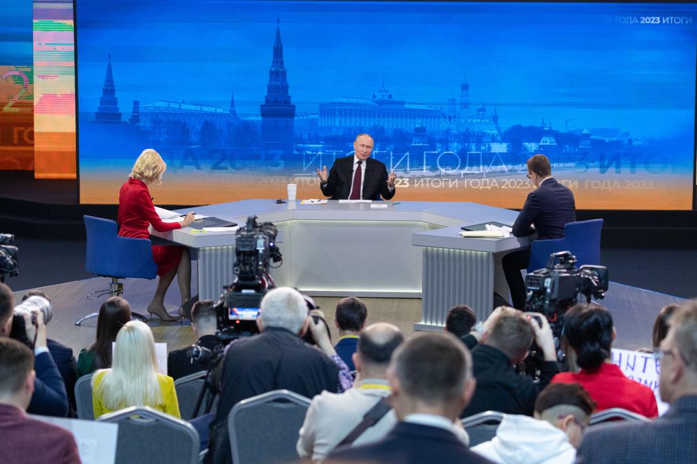 2023年12月14日,俄罗斯莫斯科,俄总统普京在“年度盘点”活动上讲话。新华社记者曹阳摄