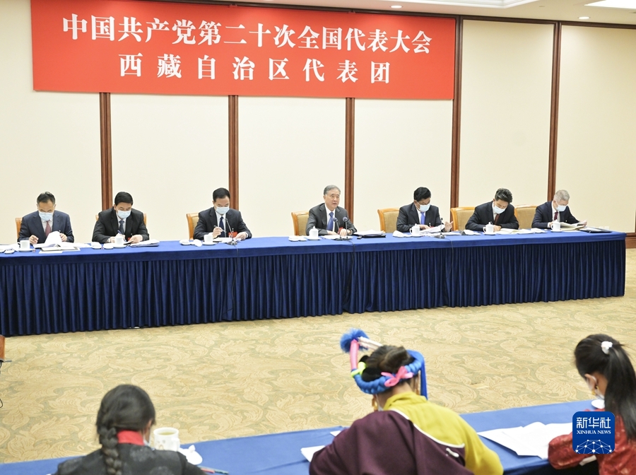 10月17日,汪洋同志参加他所在的党的二十大西藏代表团讨论。新华社记者 高洁 摄