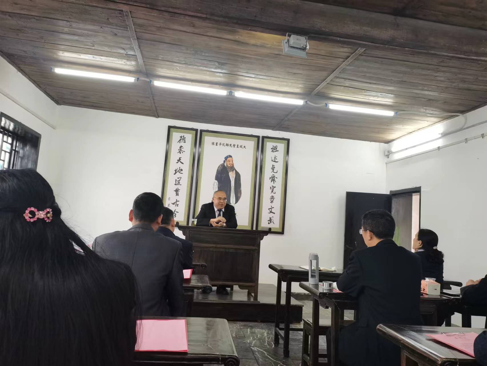 “水陆草木之花,可爱者甚蕃。晋陶渊明独爱菊。自李唐来,世人甚爱牡丹。予独爱莲之出淤泥而不染,濯清涟而不妖,中通外直,不蔓不枝,香远益清,亭亭净植,可远观而不可亵玩焉。”“无极而太极,太极动而生阳,动极而静,静而生阴,静极复动,一动一 静,互为其根,分阴分阳,两仪立焉”。县政协党组书记、主席邱文辉带领县政协委员在濂溪书院门口,一起声情并茂地朗诵了北宋诗人周敦颐所作的《爱莲说》和《太极图说》。随后,大家在濂溪书院讲堂听取了县文物管理局局长对两首散文的解析及濂溪书院的历史渊源。