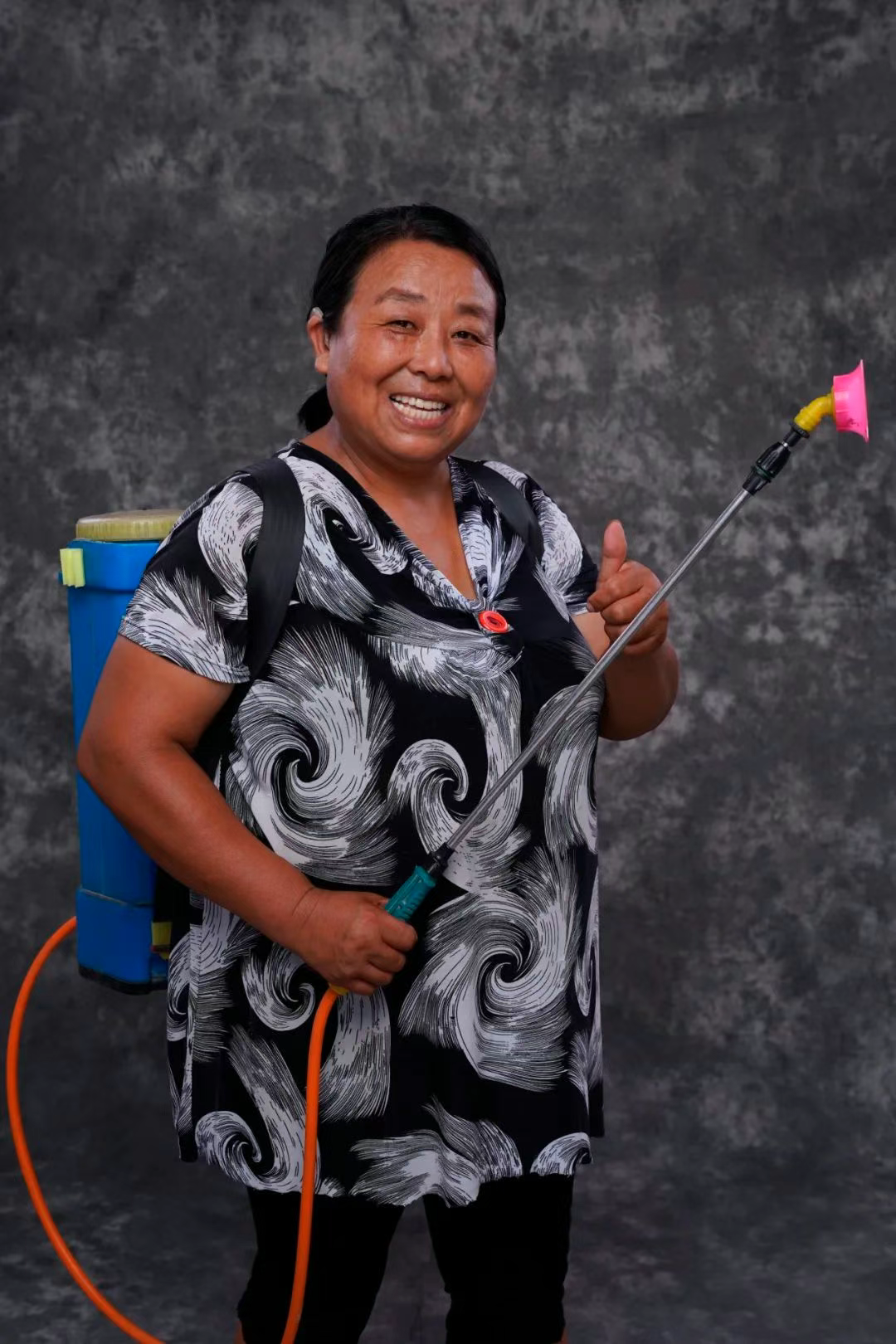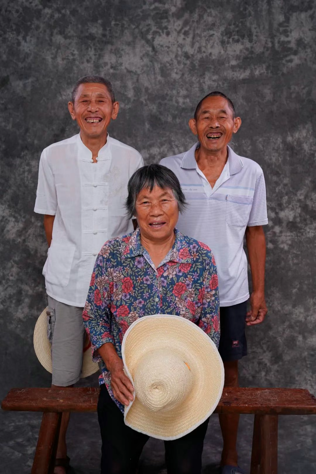 村民们的相册薄得像春茶,非得等到儿娶女嫁才肯郑重其事地坐在镜头前。“不如我来给他们拍,只要他们需要。”心里的想法突然很坚定,说干就干,2022年8月,我们把委员工作室所在的堂屋收拾干净,悬一匹洗褪色的蓝印花布作幕,雕花木窗棂筛下细碎光斑,随手抄起藤编笸箩便可以做道具,时光照相馆就这样“营业”了。