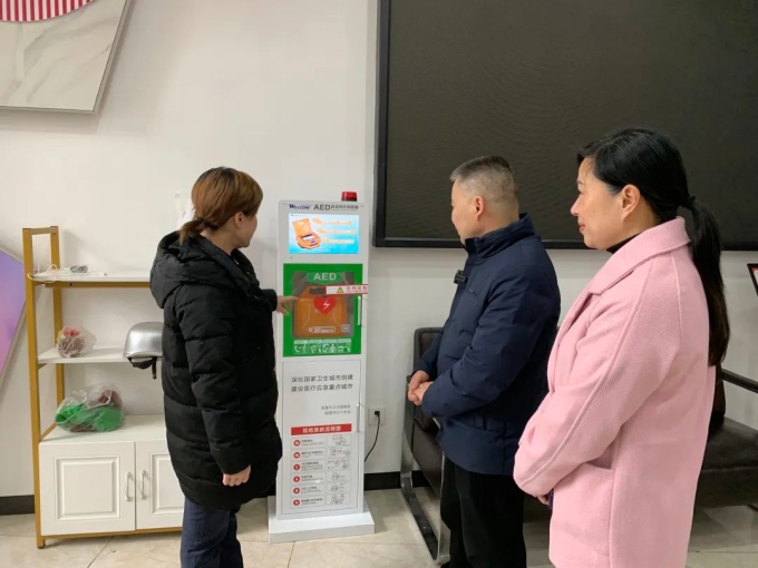 市政协委员羊柳在察看投入使用的AED紧急救护设备。