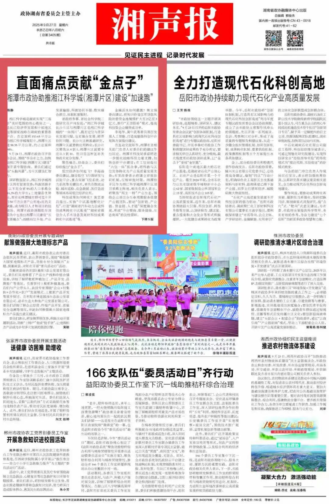 9月26日出版的湘声报头版头条刊发题为《直面痛点贡献“金点子”,湘潭市政协助推湘江科学城(湘潭片区)建设“加速跑”》的文章,全文如下: