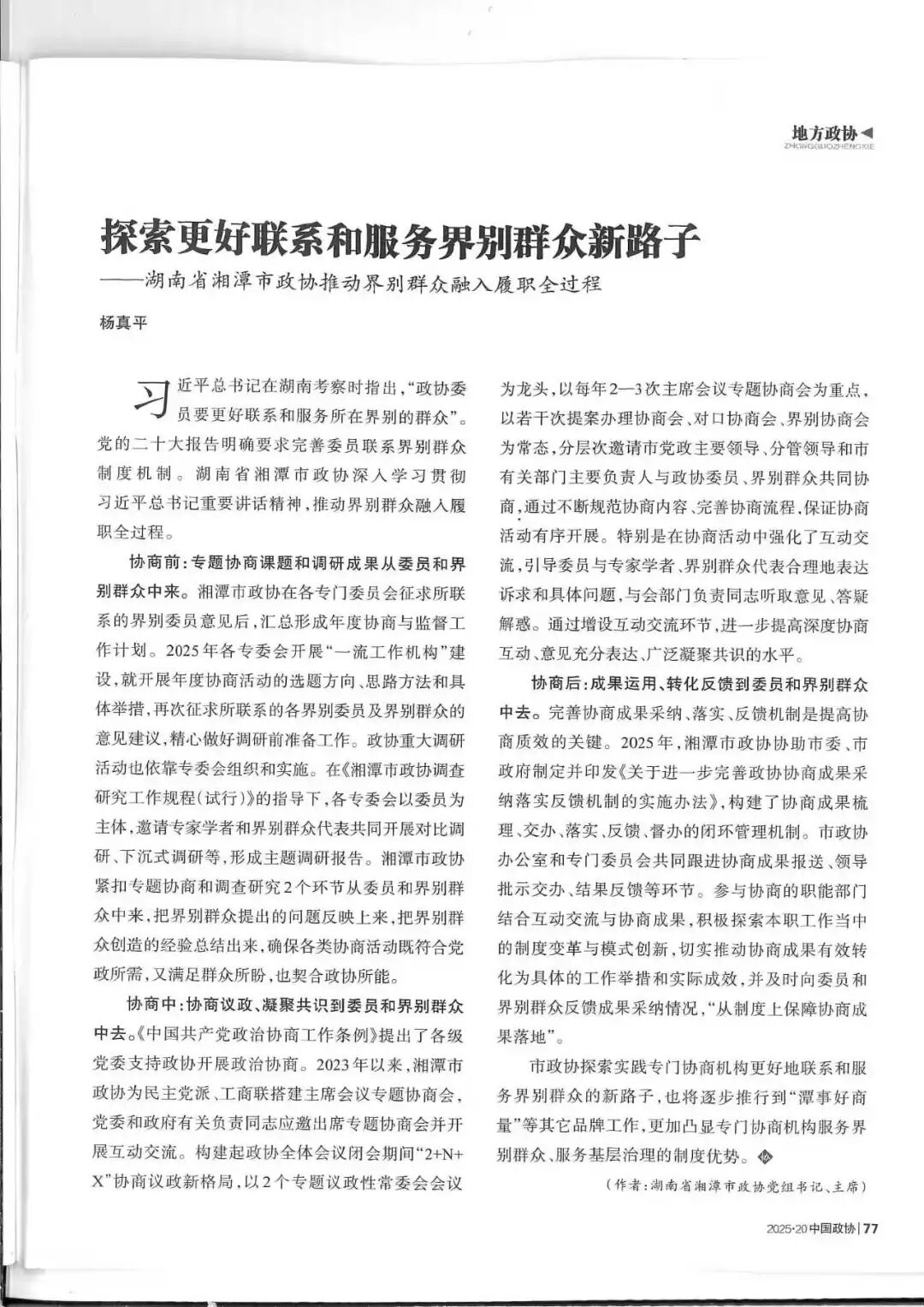 编者按:《中国政协》杂志2025年第20期刊发了湖南省政协委员、湘潭市政协主席、党组书记杨真平的署名文章《探索更好联系和服务界别群众新路子——湖南省湘潭市政协推动界别群众融入履职全过程》。文章聚焦履职全过程,清晰勾勒出“协商前课题征集调研从群众中来、协商中互动交流凝聚共识到群众中去、协商后成果转化反馈确保落地见效”的闭环机制,展现了湘潭市政协在完善制度机制、搭建协商平台、推动成果转化方面的创新实践,为更好发挥专门协商机构作用、服务基层治理提供了“湘潭经验”。