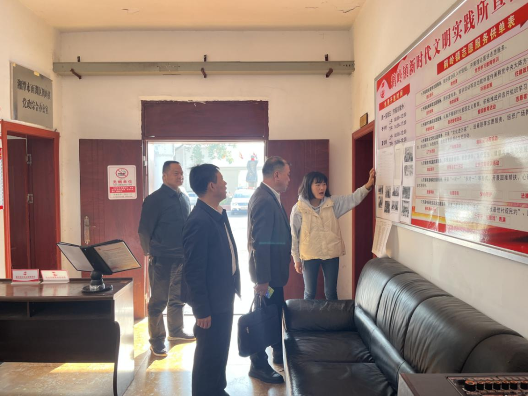 钱俊清一行先后来到鹤岭镇新时代文明实践所、果沙社区等地,实地察看新时代文明实践活动阵地建设情况,现场督查社区消防设施建设、非机动车辆停放、公益广告设置等情况。雨湖区鹤岭镇党委书记张广对辖区范围内老旧小区治理、“飞线”整治、门前“三包”、安全生产、入户走访等工作进行详细汇报。