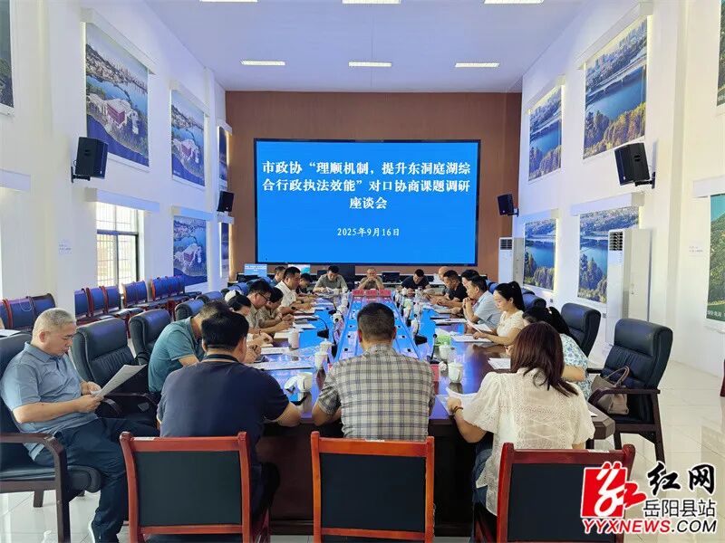 岳阳县融媒体中心9月16日讯(周昱君)9月16日,市政协常委、市政协社会法制和民族宗教委主任李卫兵率队来我县组织开展“理顺机制,提升东洞庭湖综合行政执法效能”对口协商课题调研活动,助力推动东洞庭湖综合行政执法改革走深走实、长效见效,守护湖区生态安全与可持续发展。县政协副主席彭荣欣及相关部门负责人参加。