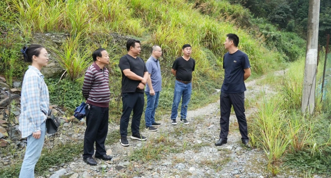 调研现场,自然资源所负责人介绍了凤形石场基本情况。凤形石场2014年取得生产许可,2020年停止开采,2021年开始进行生态修复,目前尚有部分复绿还未到位。