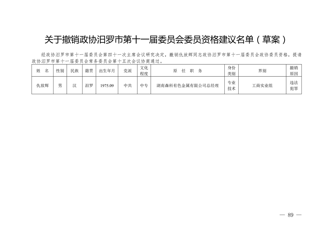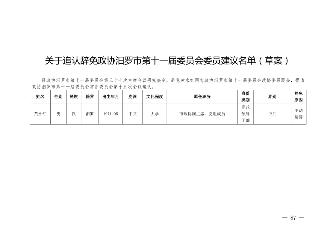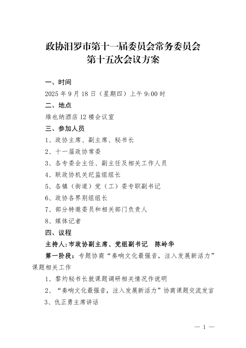 政协汨罗市第十一届委员会常务委员会 第 十 五 次 会 议