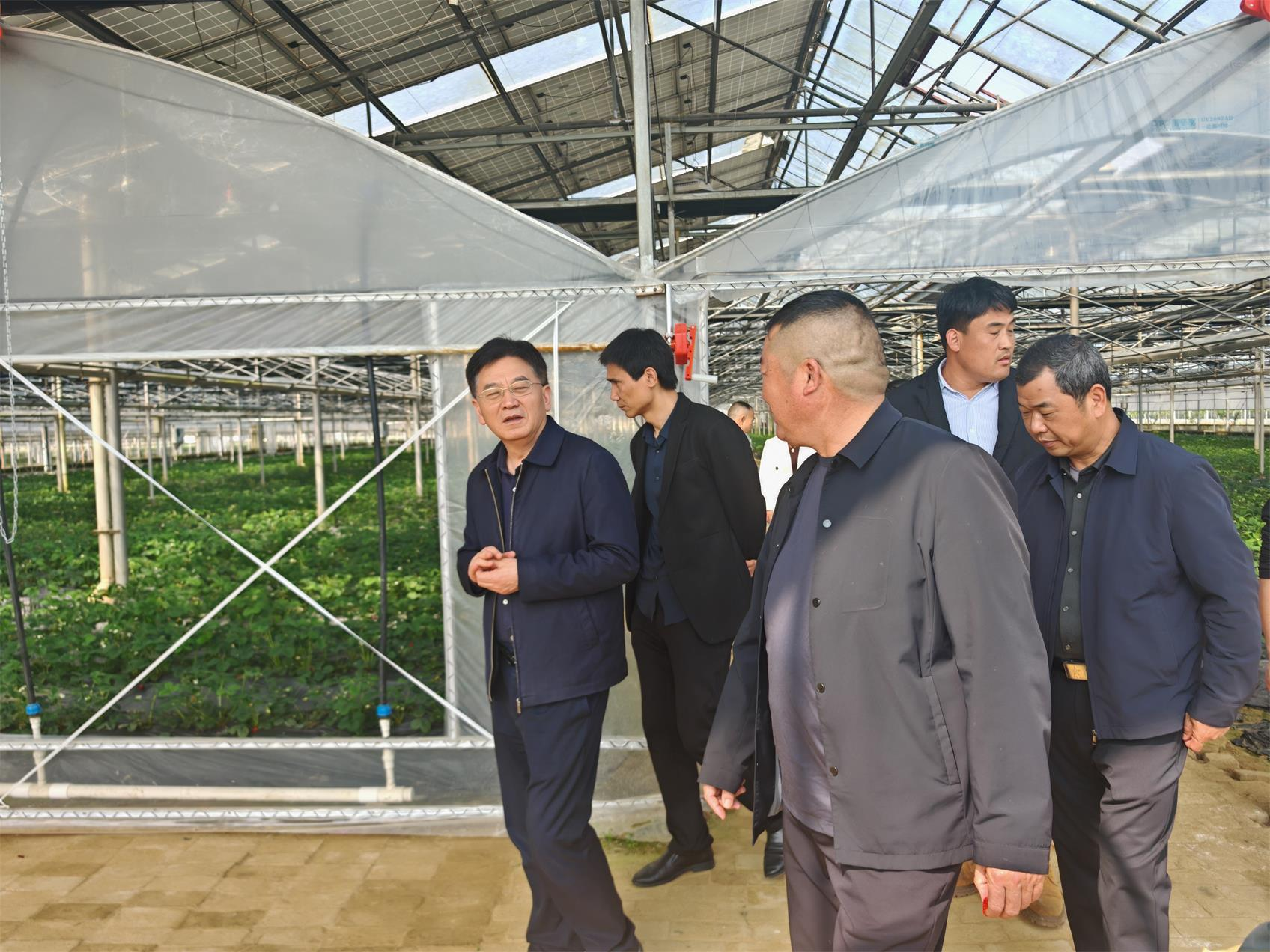 调研组先后前往伍市镇武岗村集体经济合作社、瓮江镇双潭农机农民专业合作社,进园区、看大棚、问经营,详细了解设施农业建设、运营模式、联农带农及科技赋能等情况。