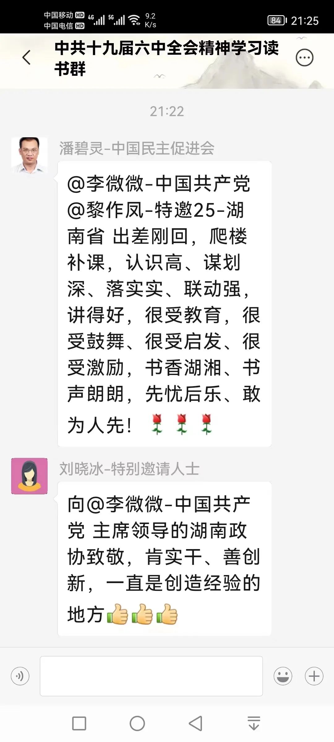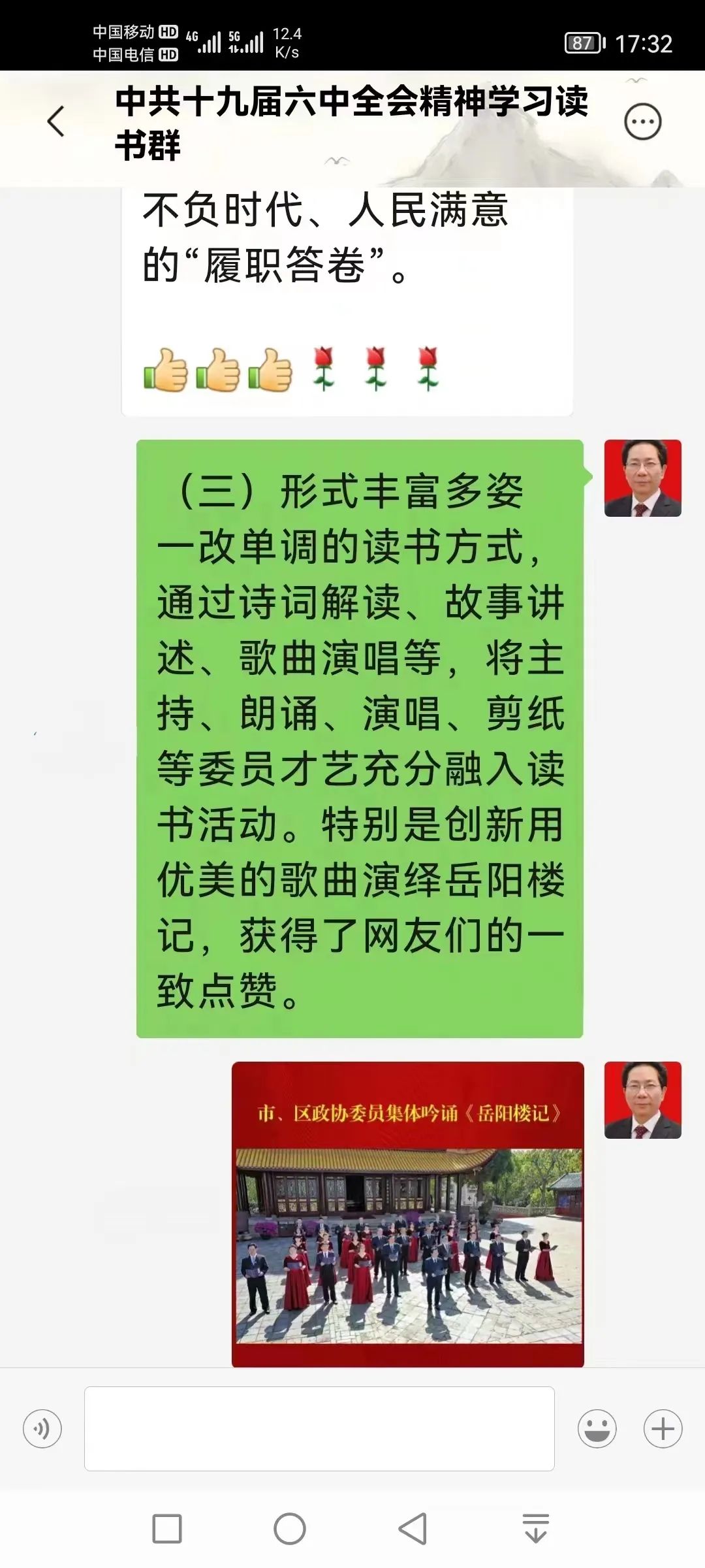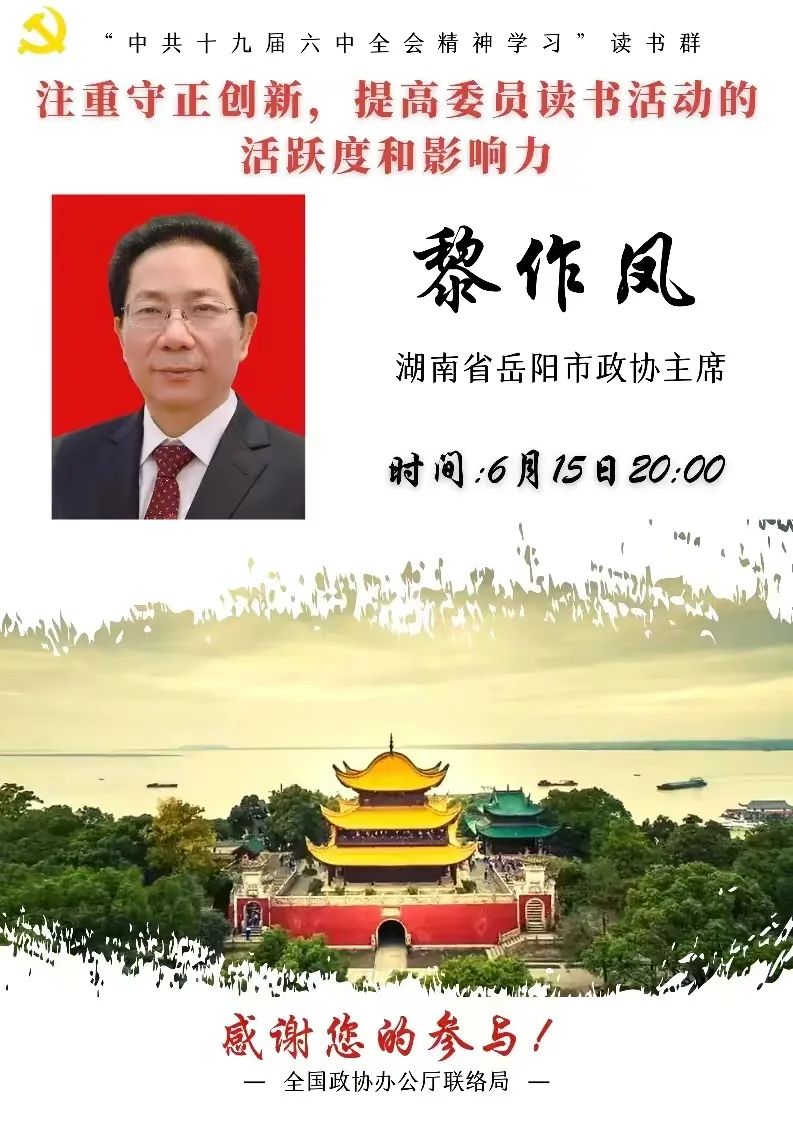 6月15日晚,全国政协书院“中共十九届六中全会精神学习”读书群湖南省政协第二场主题讲座举行。按全国政协安排,省政协委员、市政协主席、党组书记黎作凤在读书群以“注重守正创新,提高委员读书活动的活跃度和影响力”为题,介绍我市政协开展委员读书活动的典型经验。 黎作凤说,新一届市政协深入贯彻习近平总书记关于加强读书学习的重要论述,落实全国政协“以‘书香政协’促进‘书香社会’建设”和省政协树立“阅读湘军”品牌的要求,突出岳阳特色,注重守正创新,以实物、实景、实例与实事为载体,创新开展“聆诵四种精神•传承湖湘文化”实景导读委员读书活动,达到了可看、可读、可听、可唱、可游的效果。 黎作凤以图文、视频等形式,从“提高站位,坚持委员读书活动政治性”“多维联动,提升委员读书活动活跃度”“履职融合,增强委员读书活动实效性”“实景导读,扩大委员读书活动影响力”四个方面,介绍了我市政协委员把读书活动放在服务“三高四新”战略定位和使命任务、全面建设现代化新湖南和加快省域副中心城市大坐标中来定位和谋划,紧扣中心大局确定主题,通过读书活动更好服务中心大局的做法。同时,鼓励政协委员把读书所思所悟转换成大会发言、提案、社情民意信息,把建言资政的“金点子”转化成助推高质量发展的“金钥匙”。 黎作凤表示,市政协将进一步贯彻落实习近平总书记关于读书的重要指示批示精神,按照省政协的要求,深入推动读书活动走深走实,增强政协委员履职能力,提高“双向发力”质量,以“书香政协”建设促进“书香岳阳”建设。 在讲座中,全国政协委员读书群的各位委员发言、讨论、互动热烈,气氛活跃,对岳阳政协委员读书活动给与充分肯定和高度评价。读书群群主、全国政协委员、中央军委纪委原驻训练管理部纪检组少将组长常信民点评“讲课很精彩!图文并茂,清晰明了。”“岳阳政协读书活动读出了岳阳特色,富有成效”,湖南省政协主席李微微竖起了大拇指。全国政协委员、公安部原副部长孟庆丰对黎作凤的授课连连点赞,并评价“‘洞庭天下水,岳阳天下楼’,悠久的文化积淀,堆满了文化自信。古有岳阳,今又岳阳。”全国政协委员、湖南省政协副主席黄兰香评价“岳阳市政协以聆诵四种精神、传承湖湘文化为主题的读书活动,形式新颖、内涵丰富、效果明显。”全国政协委员徐自强评价“地方特色鲜明,工作卓有成效,值得点赞、学习!”。全国政协委员张东俊认为“岳阳市政协读书活动四点做法有声有色,值得学习推广!”全国政协委员、湖南省政协副主席胡旭晟评价“‘实景导读'使得读书活动情景交融,更加生动、更有现场感,既增加了读书活动的吸引力,也使之更有感染力、传播力。”(高密)