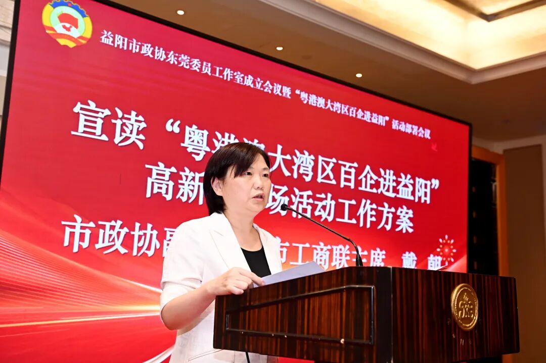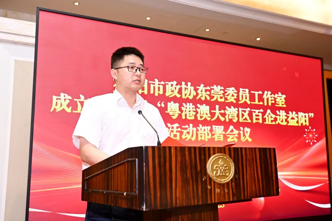 市政协副主席李晓跃主持会议。市政协副主席、市工商联主席戴朝宣读“粤港澳大湾区百企进益阳”高新区专场活动工作方案。益阳高新区管委会主任李俊杰介绍园区基本情况。市政协秘书长李赛宣读益阳市政协关于成立东莞委员工作室的批复文件。