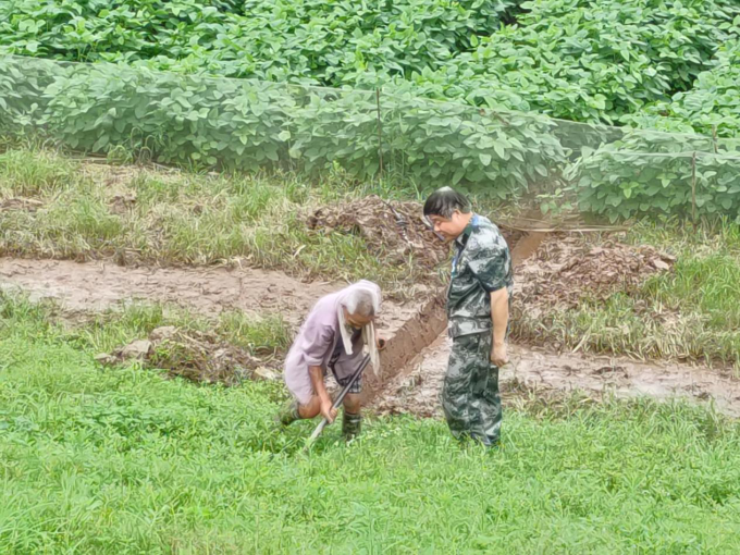 “浸沟的长度要向上挖到浸染线,宽度至少要30公分,深度要有40公分”,7月10日,南县政协副主席周建新在浪拔湖镇陈家岭段大堤指导开挖浸沟。周建新有着丰富的基层工作经验,也经历过多次防汛,这是周建新驻扎在浪拔湖镇的第七天了,他每天都会穿着雨靴深入各防汛中队指导工作。浸沟开挖对于稳固堤身非常关键,尤其要引起重视,周建新边指导开挖工作边向身边的年轻人普及防汛知识。