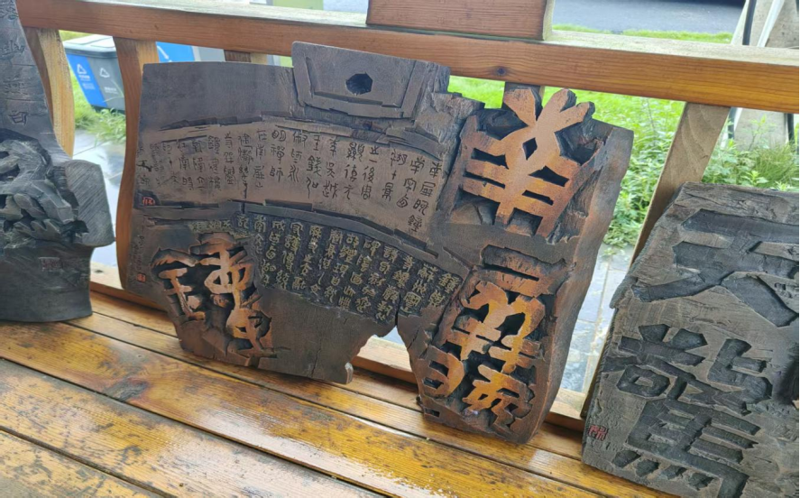 县政协主席会议成员、镇党委书记薛浩、镇党委副书记舒展炎观看刻字作品和书法作品(刘毅摄)